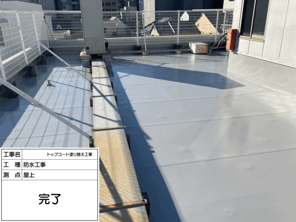 特にウレタン防水は、紫外線に弱いため、トップコートで保護することが必須です。