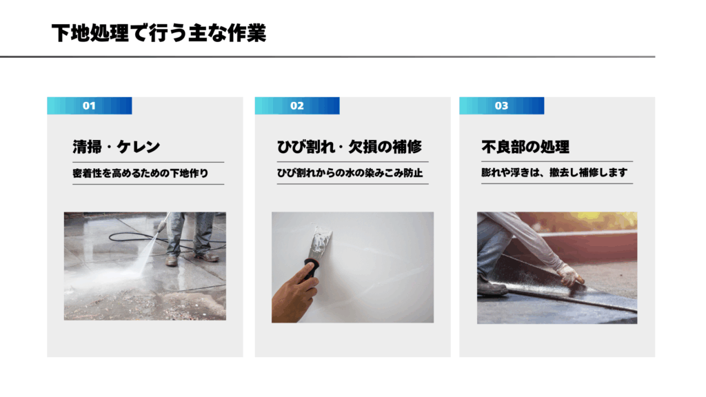 掃除やケレン(削り作業)、劣化部分の補修といった工程をしっかり行わないと、新しい防水層が密着しません。
